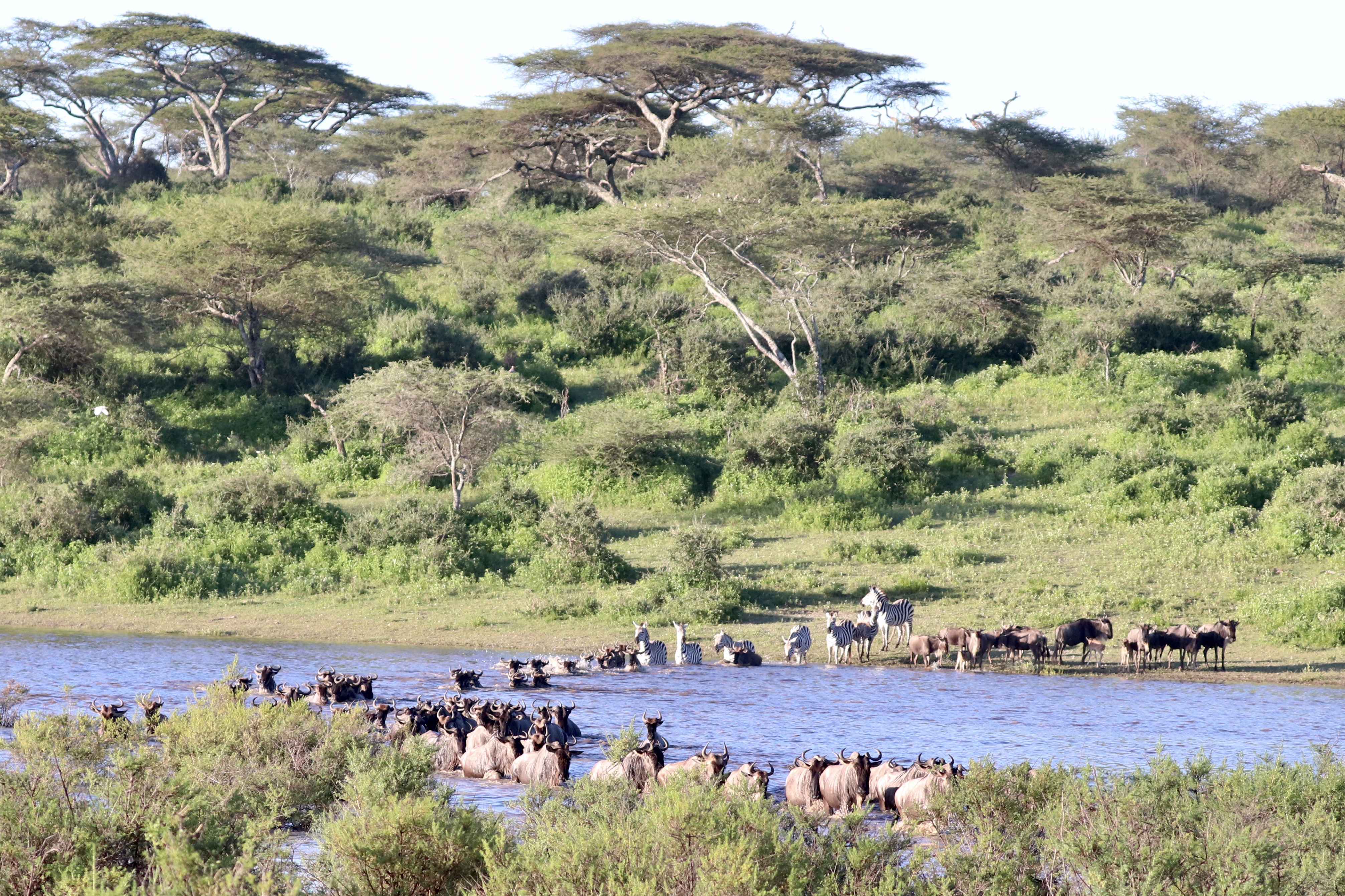 We saw a river crossing. It was magnificent. After the zebras (two babies at the end) the Mother Wildebeasts with their babies attempted to cross. When several scared Wildebeast babies turned back to shore the whole group turned back to shore and back up the bank until the babies were ready. They will try again when the babies were a bit bigger.